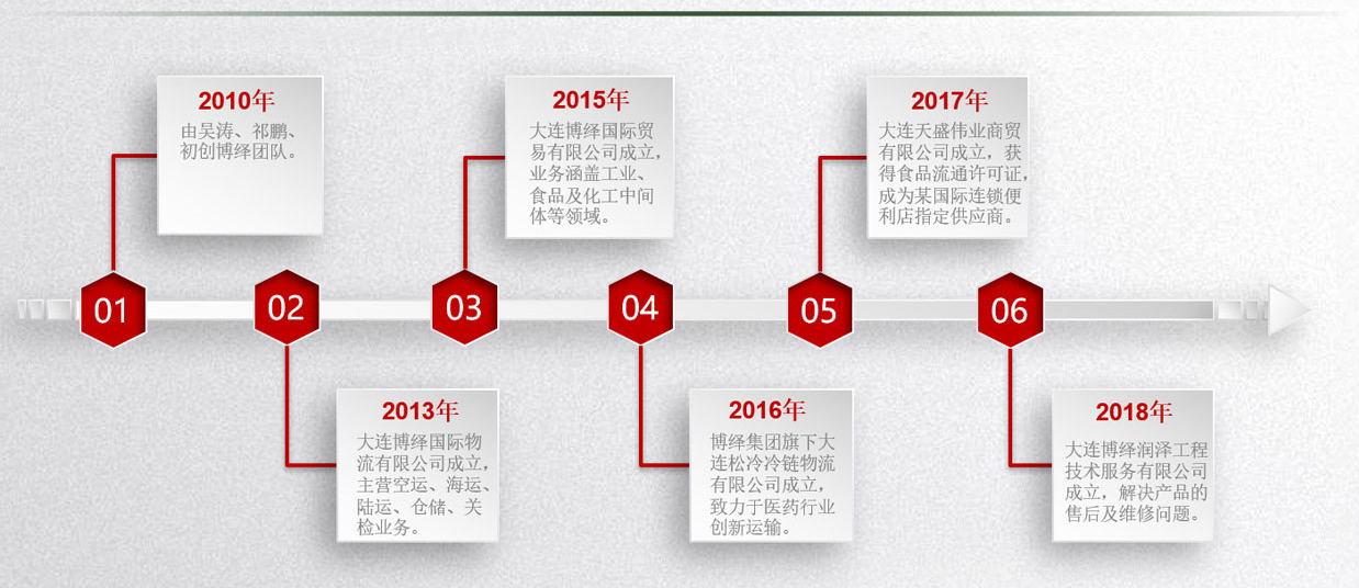 為更好地向客戶提供全球貨物流通服務(wù),集團(tuán)先后成立了大連博繹國際貿(mào)易有限公司、大連松冷冷鏈物流有限公司、大連天盛偉業(yè)商貿(mào)有限公司及大連博繹潤澤工程技術(shù)服務(wù)有限公司。在未來的發(fā)展中,集團(tuán)將繼續(xù)為客戶提供專業(yè)服務(wù),為員工實(shí)現(xiàn)自我價(jià)值,為社會(huì)和諧發(fā)展和文明進(jìn)步做貢獻(xiàn)。